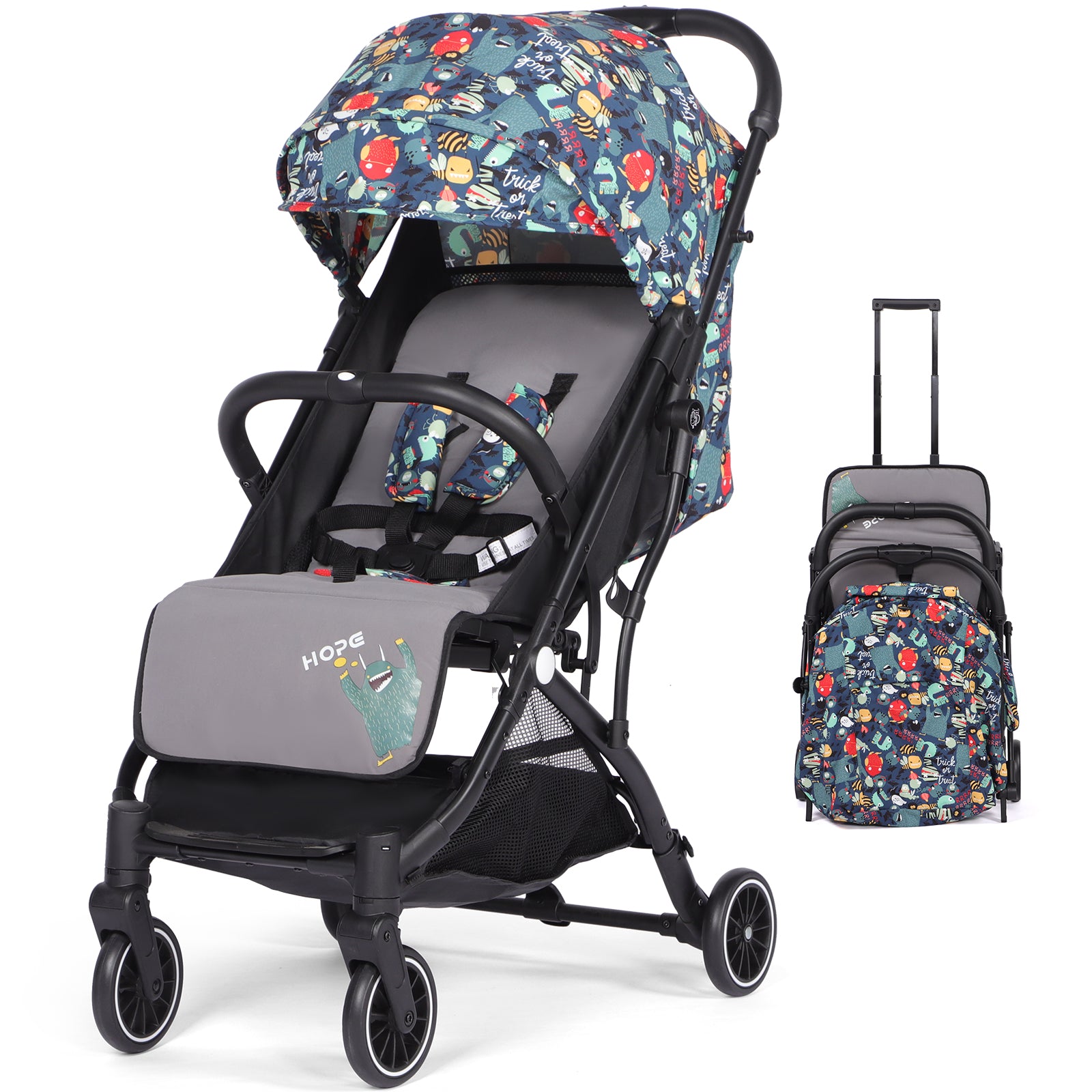 One-Hand Fold, 5-point Harness, Adjustable Backrest and Leg Rest |